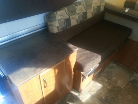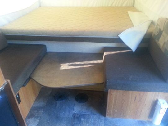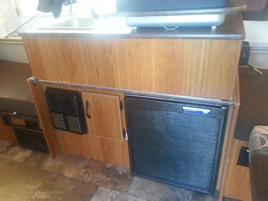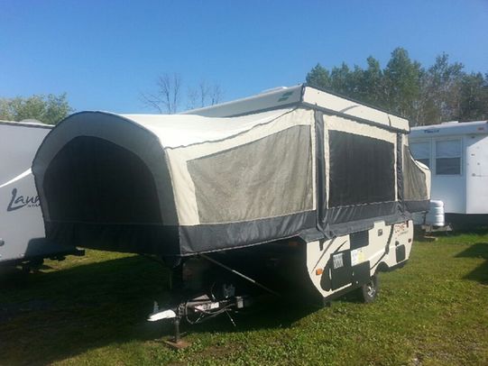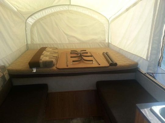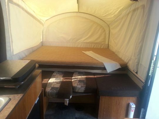 It sleeps up to 7 and comes equipped with a fridge, stove, furnace, water heater, cd stereo, dual roof vents, and electric power winch to raise and lower the roof.